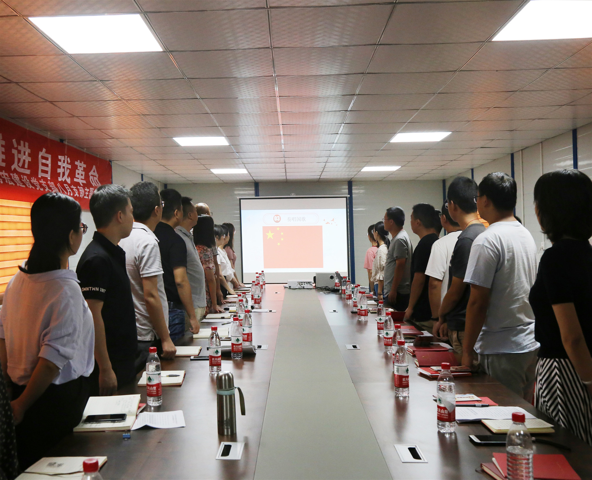 10點(diǎn)整,公司黨員進(jìn)入琴臺(tái)天地項(xiàng)目部會(huì)議室簽到、佩戴黨徽,進(jìn)行黨費(fèi)繳納。隨后在支部副書記郭一清同志的主持下,在全體黨員重溫入黨誓詞的浩大聲勢中,拉開了這次主題教育活動(dòng)的帷幕。