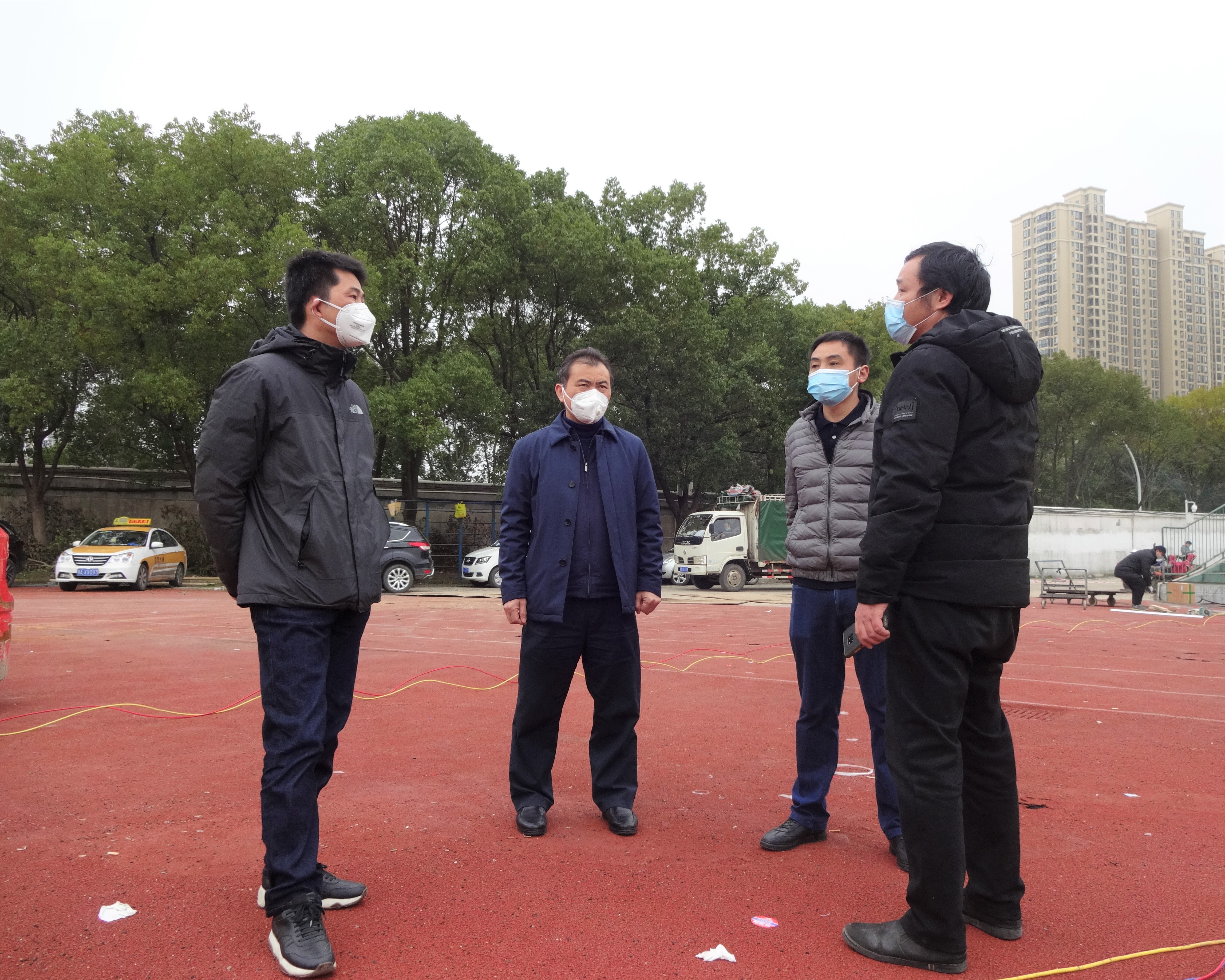 3月1日晚接到建設(shè)任務(wù)后,漢陽市政黨委書記、董事長嚴悌文,總經(jīng)理虞志鵬,常務(wù)副總經(jīng)理王智高連夜組建施工專班,親赴現(xiàn)場進行考察并確定施工方案。當晚,項目人員組織材料進場直至凌晨1點,最終從40公里以外的漢陽開發(fā)區(qū)將木芯板、門板、鋼立柱、焊接方管等施工材料全部運送進場。漢陽市政致遠公司、博宏公司共計投入40余名管理人員、300余名工人參與施工。經(jīng)過緊鑼密鼓的籌備工作,現(xiàn)場施工有序進行,板房吊裝、隔斷安裝、水電、化糞池均同步進行施工。