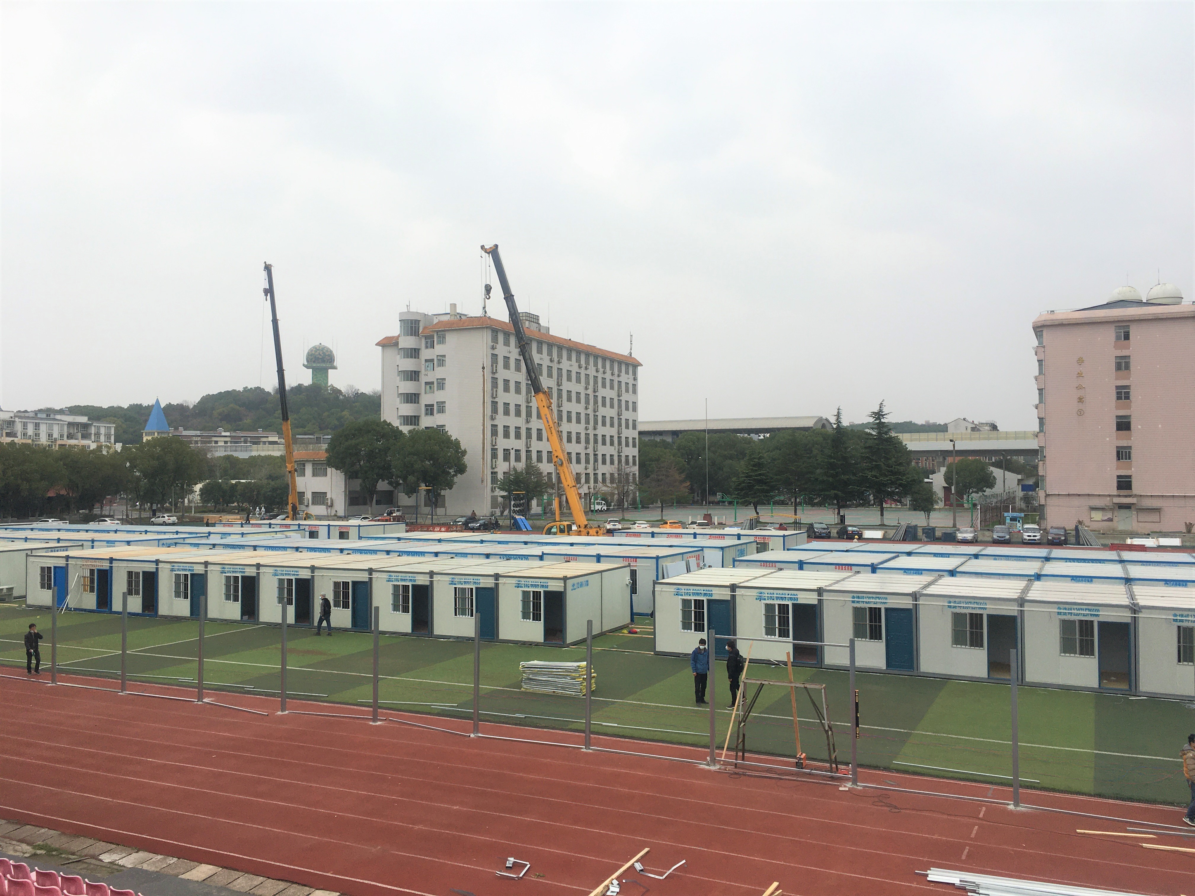 武漢警官職業(yè)學(xué)院方艙醫(yī)院位于東西湖區(qū)東吳大道,利用學(xué)校足球場采用活動板房形式進行建設(shè)。該方艙醫(yī)院計劃安裝板房200個,每個板房隔斷為2個房間,共設(shè)置床位374張,并另外設(shè)置醫(yī)生更衣室、醫(yī)生值班室、洗漱區(qū)及移動衛(wèi)生間。由于該方艙醫(yī)院將用作武漢女子監(jiān)獄隔離點位,在常規(guī)方艙醫(yī)院配置的基礎(chǔ)上,外圍設(shè)置有長達390米的防護圍欄,病房及防護圍欄將全部加裝監(jiān)控設(shè)備。