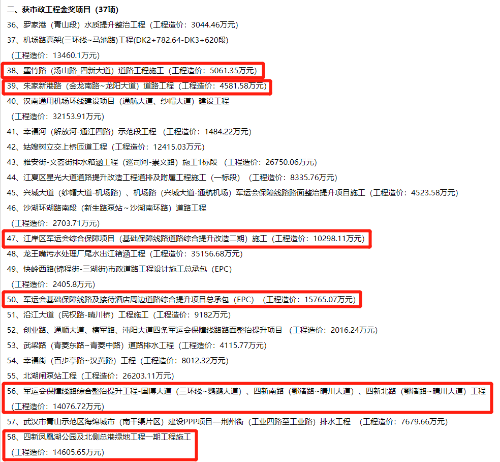 2019年武漢市市政工程金獎入選工程項(xiàng)目名單公示
