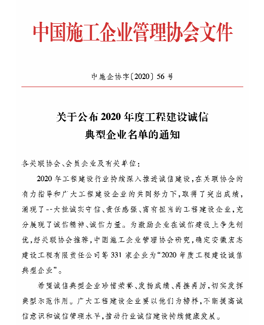 ? ? ? 2020年工程建設(shè)行業(yè)持續(xù)深入推進誠信建設(shè),廣泛開展行業(yè)信用評價工作。近日,中國施工管理協(xié)會公布了“2020年度第一批工程建設(shè)企業(yè)信用評價”和“2020年度工程建設(shè)誠信典型企業(yè)”名單,漢陽市政多個公司獲評榮譽。