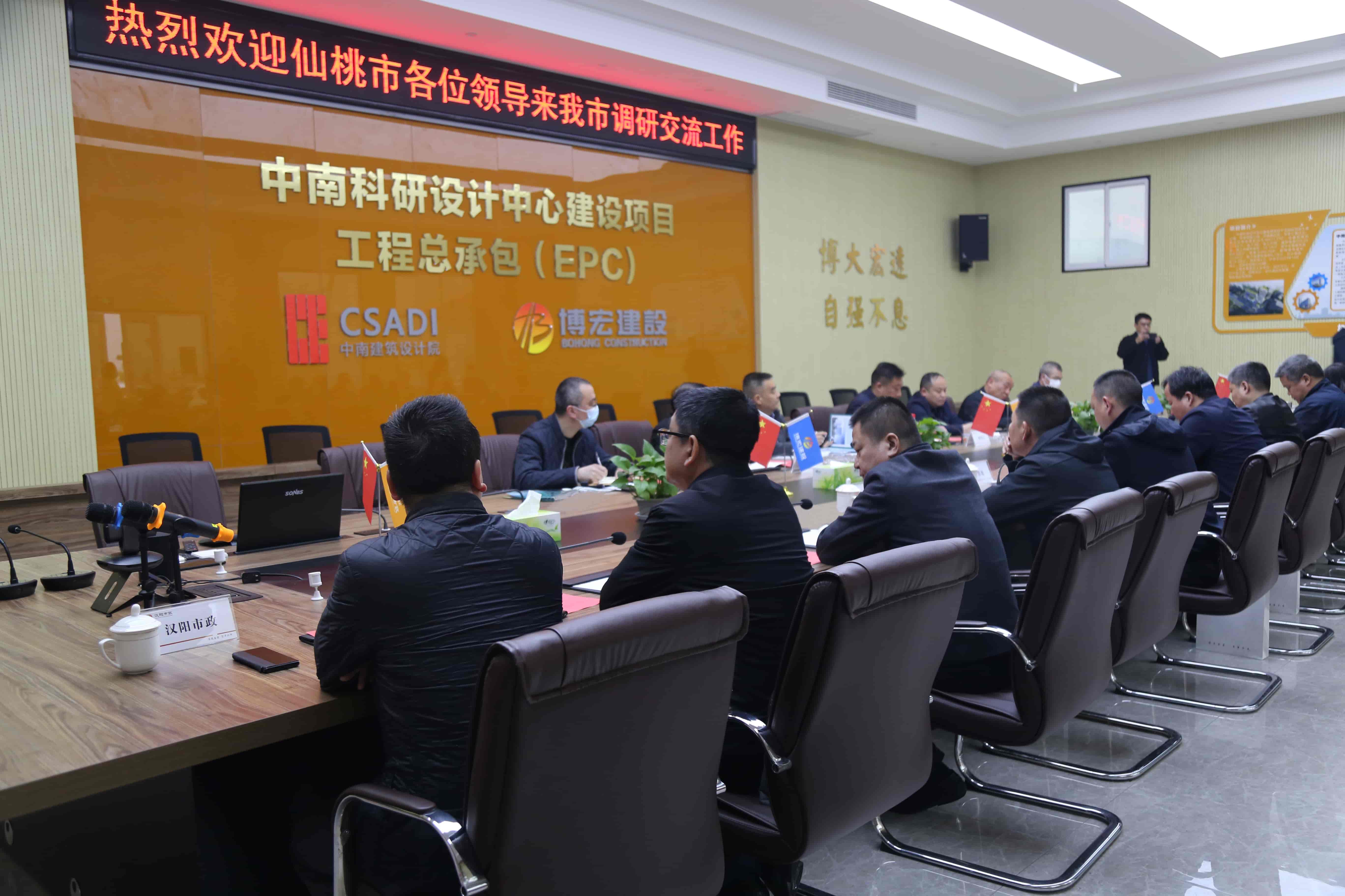 現(xiàn)場(chǎng)調(diào)研結(jié)束后,調(diào)研座談會(huì)在中南科研設(shè)計(jì)中心項(xiàng)目部舉行。仙桃市人民政府、仙桃市住建局與武漢市城建局、漢陽(yáng)區(qū)建設(shè)局、漢陽(yáng)市政等單位代表共同參會(huì)。