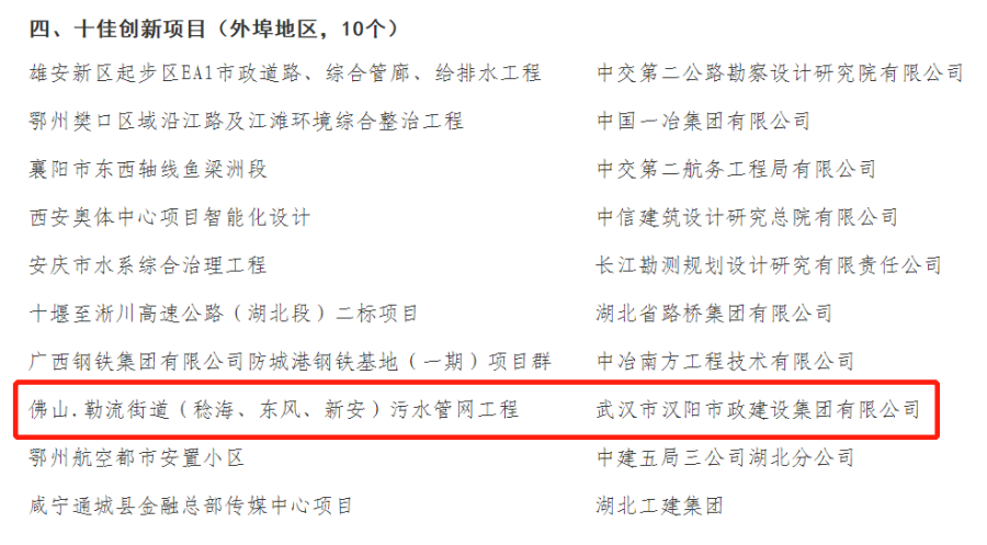 在2021年第七屆武漢建筑及勘察設(shè)計(jì)行業(yè)勞動(dòng)競賽“雙十佳”選樹活動(dòng)中,羅明飛獲評(píng)武漢地區(qū)十佳建設(shè)者,漢陽市政承建的廣東佛山勒流街道(稔海、東風(fēng)、新安)污水管網(wǎng)工程獲評(píng)外埠地區(qū)十佳創(chuàng)新項(xiàng)目。