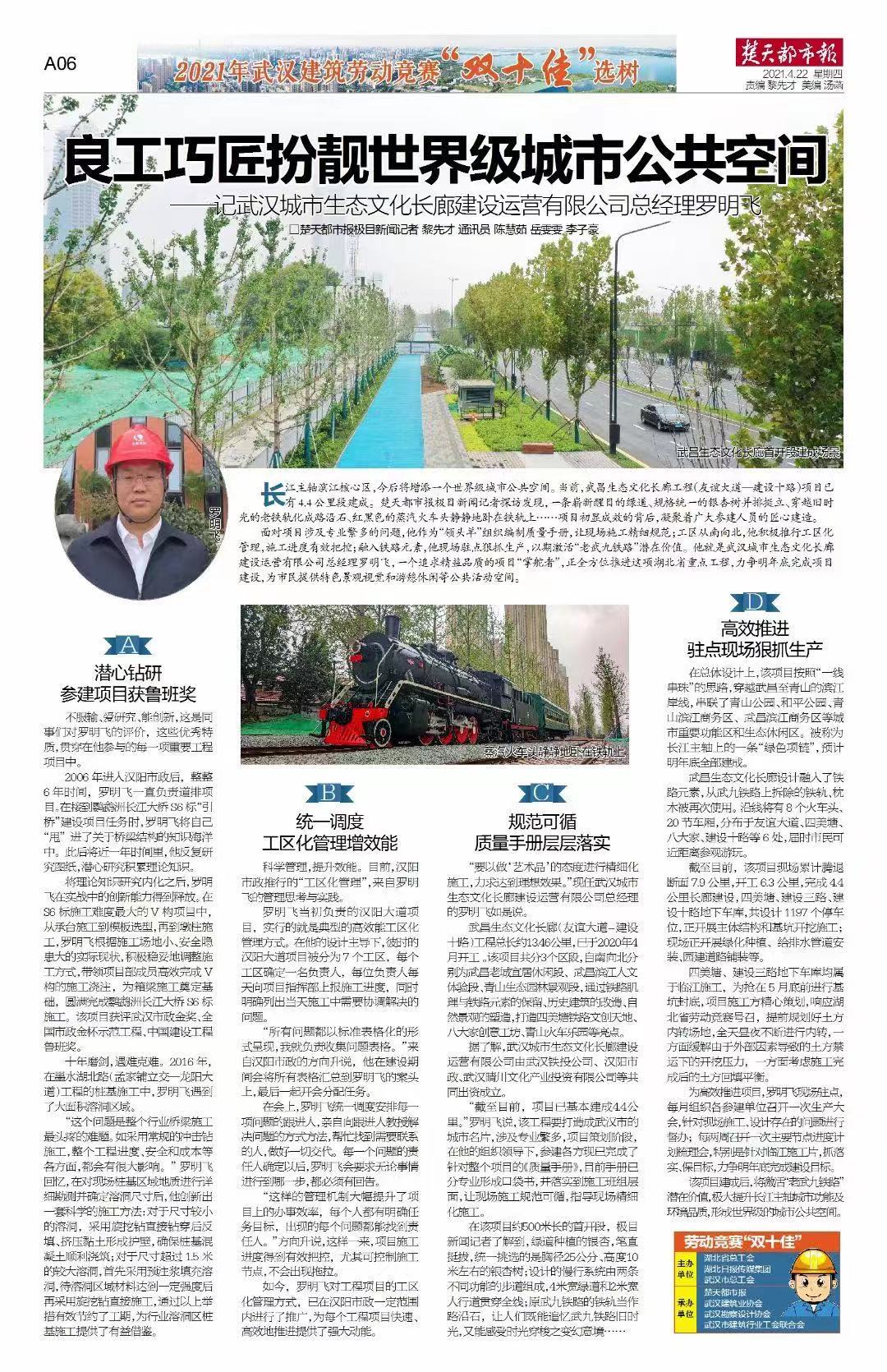 楚天都市報:良工巧匠扮靚世界級城市公共空間——記武漢城市生態(tài)文化長廊建設(shè)運營有限公司總經(jīng)理羅明飛