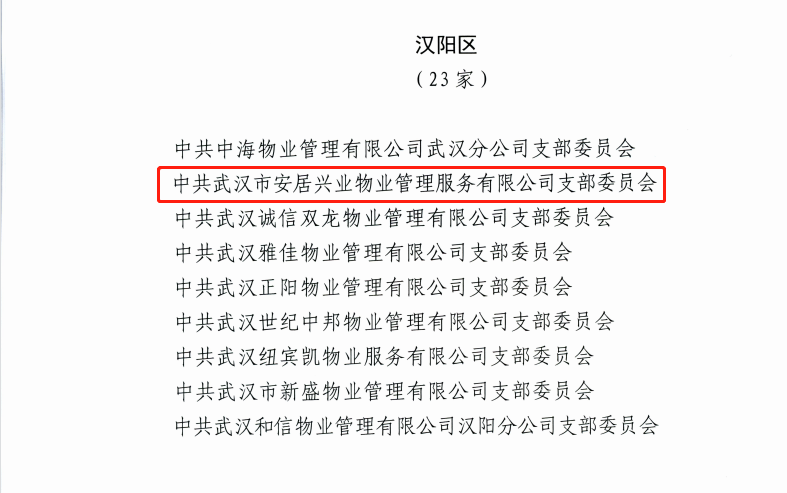 近日,中共武漢市物業(yè)行業(yè)委員會公布《2021年武漢市物業(yè)行業(yè)基層黨組織示范點名單》,漢陽市政安居興業(yè)公司黨支部名列其中。經各區(qū)物業(yè)行業(yè)黨委推薦報送,武漢市物業(yè)行業(yè)黨委審核評定,全市共有186個基層黨組織被命名為“2021年武漢市物業(yè)行業(yè)基層黨組織示范點”。