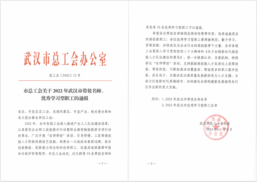 師徒結(jié)對傳匠心,青藍(lán)相接鑄輝煌。2022年11月8日,根據(jù)武漢市總工會(huì)辦公室發(fā)布的《市總工會(huì)關(guān)于2022年武漢市帶徒名師、優(yōu)秀學(xué)習(xí)型職工的通報(bào)》,漢陽市政羅明飛、李子豪、陳文獲評“武漢市帶徒名師”,林志剛、易曉輝獲評“武漢市優(yōu)秀學(xué)習(xí)型職工”。