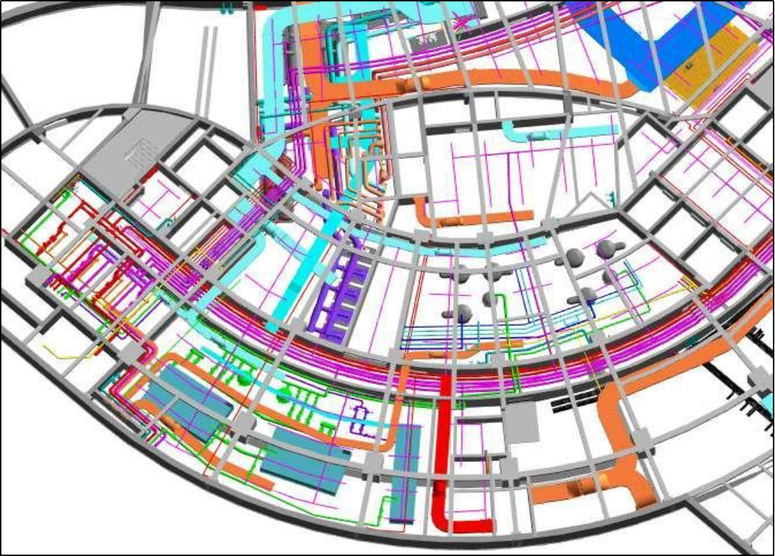 本工程利用BIM技術(shù)指導施工,為使地下室弧形區(qū)域的管道施工美觀整潔,BIM排布時采用了弧形成排管道,管線采用頂彎技術(shù),在管道工廠進行集約化加工,實現(xiàn)了管線的精確定位,安裝效果美觀。