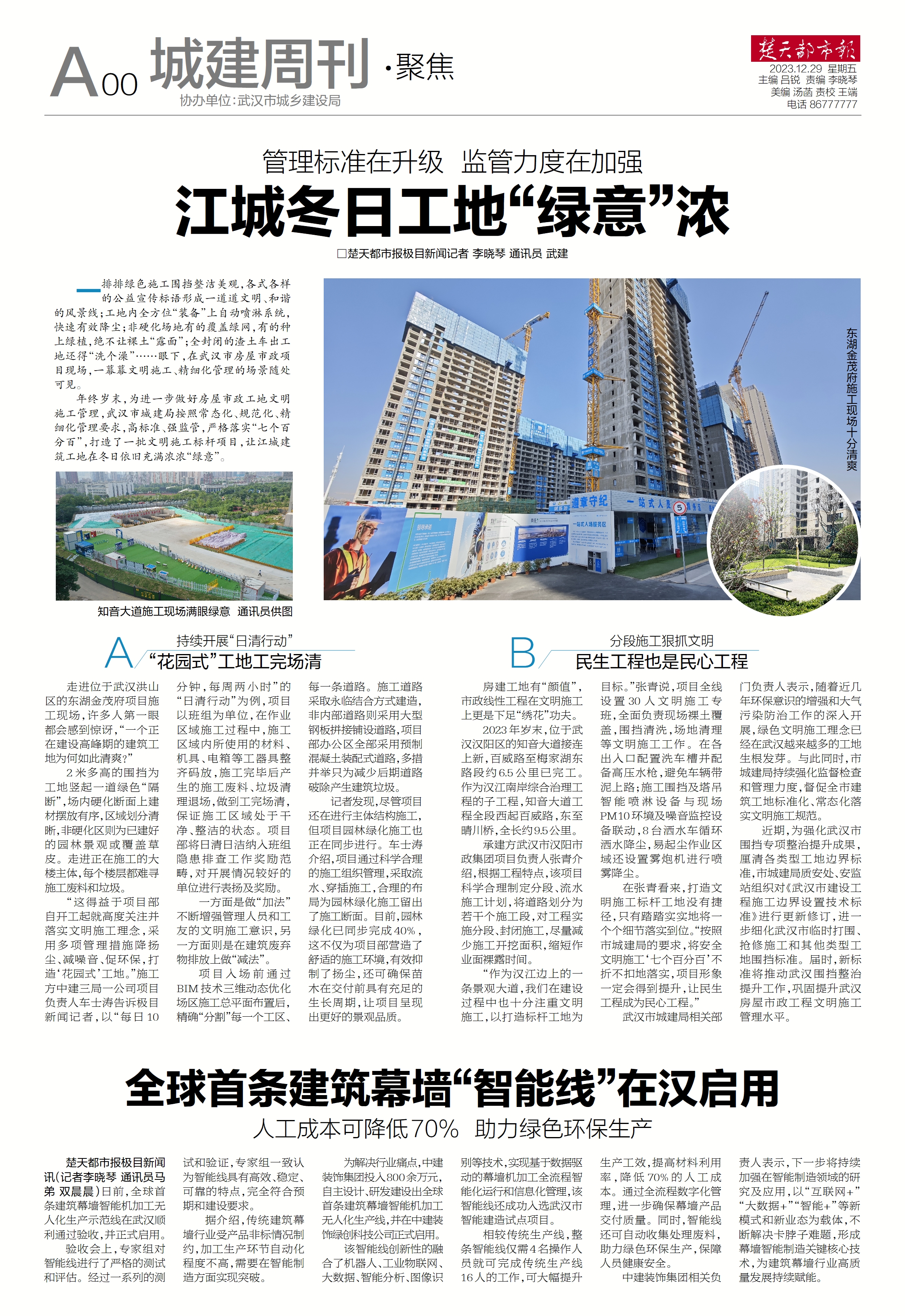 楚天都市報推出《管理標準在升級 監(jiān)管力度在加強 江城冬日工地“綠意”濃》專版報道。