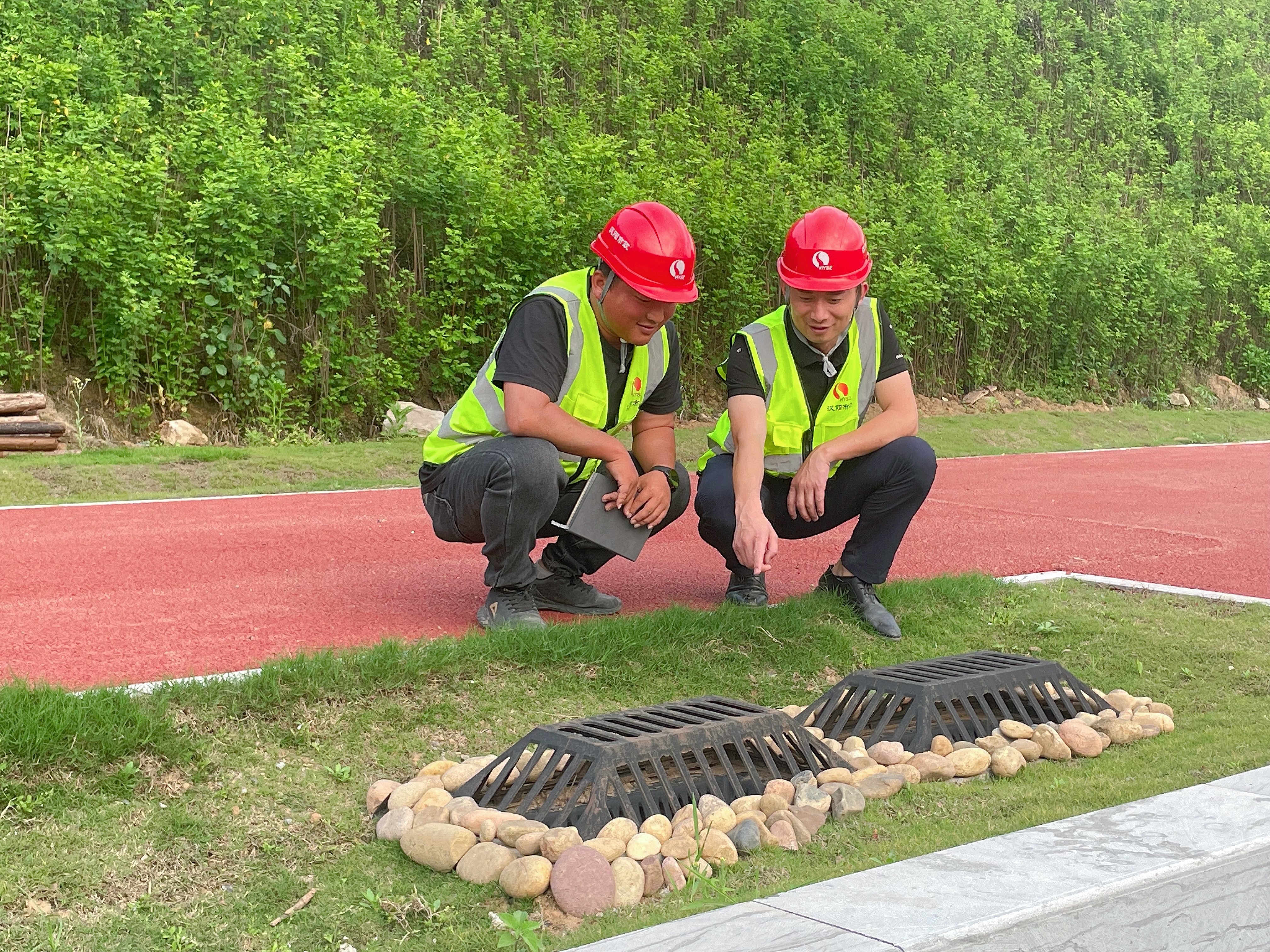 李苗(右)指導(dǎo)現(xiàn)場(chǎng)海綿城市精細(xì)化施工