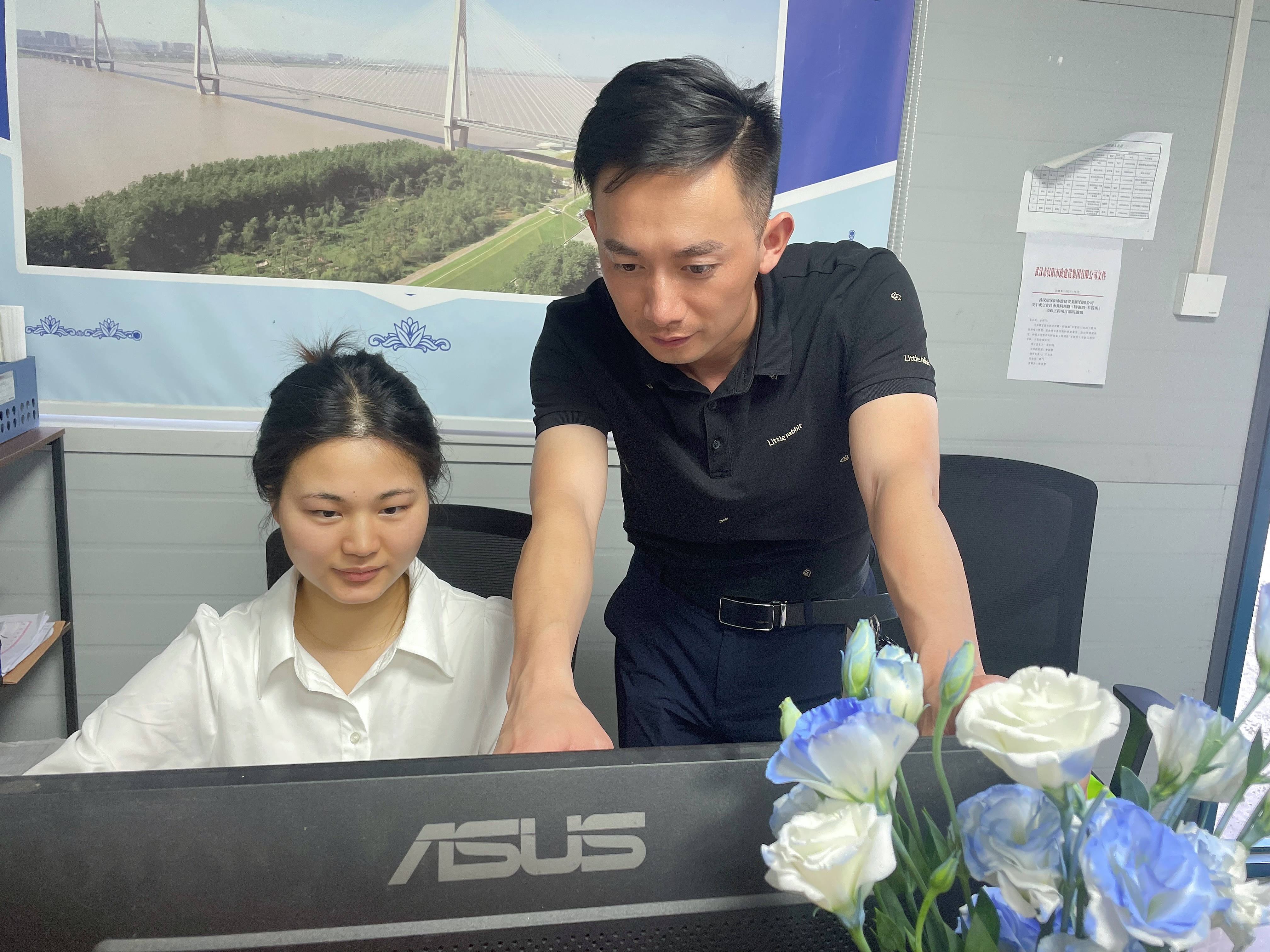 李苗(右)指導(dǎo)項(xiàng)目部員工