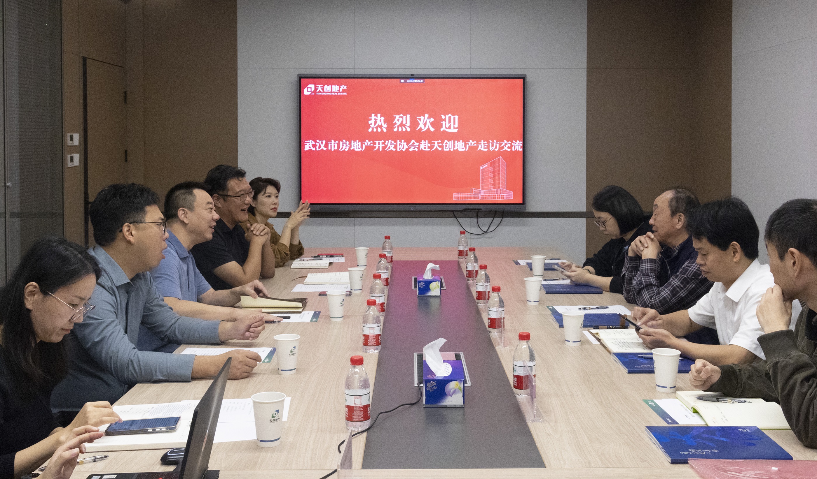 天創(chuàng)地產(chǎn)總經(jīng)理李軍偉對(duì)張漢培會(huì)長(zhǎng)一行來(lái)訪表示熱烈歡迎,并為協(xié)會(huì)全面介紹了天創(chuàng)地產(chǎn)發(fā)展現(xiàn)狀及項(xiàng)目實(shí)際情況,指出天創(chuàng)地產(chǎn)自成立以來(lái),始終秉承“匠心善建 創(chuàng)筑美好”的企業(yè)理念,截止目前,已為百余項(xiàng)政府投資項(xiàng)目提供全周期代建管理服務(wù),并在武漢、襄陽(yáng)、宜昌、長(zhǎng)沙四地布局,形成“7項(xiàng)目交付+6項(xiàng)目入市+1地塊儲(chǔ)備”的開(kāi)發(fā)業(yè)務(wù)布局,截止目前已榮獲包括國(guó)家級(jí)廣廈獎(jiǎng)、2024中國(guó)房地產(chǎn)企業(yè)成長(zhǎng)生命力品牌等在內(nèi)的多項(xiàng)榮譽(yù)認(rèn)可。